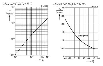 圖5:純綠光LED 伏安特性和正向電流溫度特性 圖6:綠光LED 相對光通量及其溫度特性