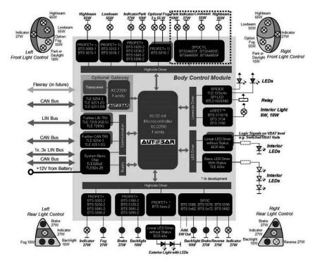 隨著汽車電子的發(fā)展,目前BCM設(shè)計的趨勢是平臺化和高集成度化兩個趨勢。平臺化SBC、SPI器件、共用ADC,以及高低邊可配等。 主要通過器件的兼容性來實現(xiàn)。集成度主要是提高器件的集成度,例如采用系統(tǒng)基礎(chǔ)芯片將電源、CAN收發(fā)器、LIN收發(fā)器集成到一個芯片上,在功率輸出方面采用SPI控制的多通道器件實現(xiàn)集成。英飛凌半導(dǎo)體在這兩方面均有豐富的產(chǎn)品鏈,如TLE826X和TLE926X系列SBC器件,多路高低邊SPOC和SPIDER家族。圖14(a)是BCM平臺化示意圖。