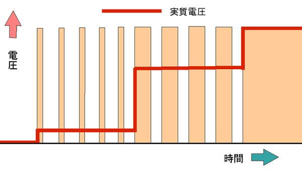 維基百科日文的一張圖,圖示了通過PWM,得到不同電壓直流電的方法。