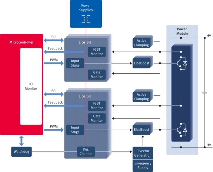 EiceDRIVER Boost是增強(qiáng)了輸出電流能力的推挽輸出放大器,并集成了相關(guān)保護(hù)能力。它有一個專屬的輸入口,可以將輸入驅(qū)動PWM信號推動IGBT。來自于看門狗IC的信號,控制控制PWM是否能驅(qū)動IGBT。IGBT門級信號監(jiān)視器和輸出級監(jiān)視器等多項監(jiān)測功能,可保證安全監(jiān)控路徑的可靠。