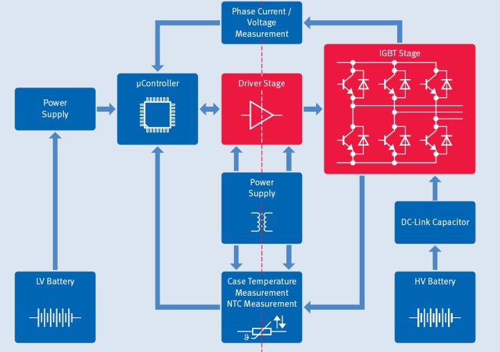 逆變器主要組成部分包括兩部分(如圖1)高功率的IGBT模塊和由12V電池供電控制邏輯。當(dāng)前典型的技術(shù)是通過一個集成的隔離驅(qū)動器,隔離邏輯電路和功率模塊,并驅(qū)動IGBT模塊,這就是所謂的IGBT門級驅(qū)動器。