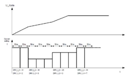 斜率控制功能集成在預(yù)驅(qū)動(dòng)模塊,直接控制驅(qū)動(dòng)電流,間接的把MOSFET的門級(jí)電壓上升或者下降曲線分為四段分別控制;每一段曲線可以通過(guò)寄存器設(shè)置驅(qū)動(dòng)MOSFET電流的大?。?2個(gè)等級(jí))和時(shí)間(8個(gè)等級(jí),50ns到400ns),靈活性非常高,如下圖所示: