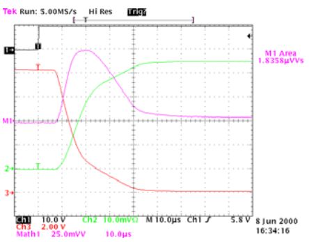 圖7:開(kāi)通時(shí)的電壓,電流和損耗曲線