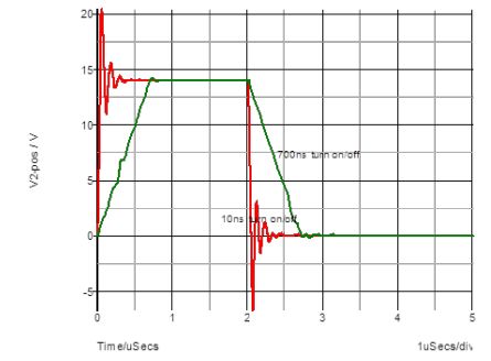 利用電路仿真軟件,如下圖所示,綠色曲線是700ns開(kāi)關(guān)速度的門級(jí)電壓波形,紅色曲線是10ns開(kāi)關(guān)速度的電壓波形。開(kāi)關(guān)速度太快會(huì)導(dǎo)致MOSFET的門級(jí)電壓出現(xiàn)過(guò)沖和震蕩,一方面過(guò)沖的電壓會(huì)對(duì)電路造成損壞,另一方面,太快的斜率和電壓震蕩都會(huì)產(chǎn)生更多的電磁干擾。