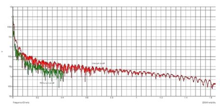 下圖的綠色曲線是700ns開(kāi)關(guān)速度的頻譜分析,紅色曲線是10ns開(kāi)關(guān)速度的頻譜分析,10ns的開(kāi)關(guān)速度會(huì)產(chǎn)生更多的電磁干擾。