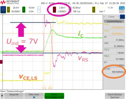 測試結(jié)果: Uind = 7 V,所以得到漏感Lsh = 7V / 590A/μs = 11.9 nH。用頻域的傳遞函數(shù)來表述采樣信號,因為R1?RS+s?Lσ,可以得到