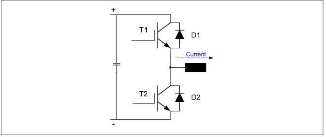 死區(qū)時間一方面可以避免橋臂直通,另一方面也會帶來不利影響。以圖2為例,首先假設(shè)輸出電流按圖示方向流動,而IGBT T1由開通到關(guān)斷,經(jīng)過一小段死區(qū)時間后IGBT T2由關(guān)斷到開通。 在有效死區(qū)時間內(nèi),兩個開關(guān)管都是關(guān)斷的,且續(xù)流二極管D2流過輸出電流。此時負(fù)的直流電壓加在輸出側(cè),此時電壓極性符合設(shè)計的要求。考慮另一種情況,T1由關(guān)斷到開通,而T2由開通到關(guān)斷,此時,由于電流還是沿著同一個方向,這一電流在死區(qū)時間依然流過,因此輸出電壓還是為負(fù)值,此時電壓極性不是設(shè)計希望得到的。結(jié)論可以總結(jié)如下:在有效死區(qū)時間里,輸出電壓由輸出電流決定,而非控制信號。
