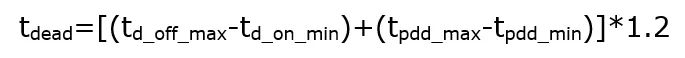 在該公式中,第一項(xiàng)td_off_max-td_on_min為最大關(guān)斷延遲時間和最小開通延遲時間之差。這一項(xiàng)主要描述IGBT器件結(jié)合所用的門極電阻的特性。由于上升和下降時間通常比延遲時間短很多,這里就不考慮它們。另一項(xiàng)tpdd_max-tpdd_min為由驅(qū)動器決定的傳輸延遲時間之差(延遲時間不匹配)。該參數(shù)通??稍隍?qū)動器制造商提供的驅(qū)動器數(shù)據(jù)表中查找到。對于基于光耦合器的驅(qū)動器,該參數(shù)值通常很大。
