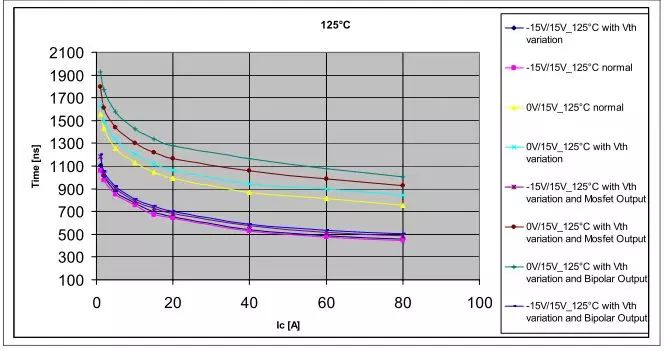 從以上結(jié)果中可以看出,集電極電流Ic發(fā)生變化時,開通延遲時間幾乎保持不變。-15V/+15V的門極電壓下的開通延遲時間,比0V/+15V的門極電壓條件下要長。但該變化很小,且考慮到額外的安全裕量,因此可以忽略不計。