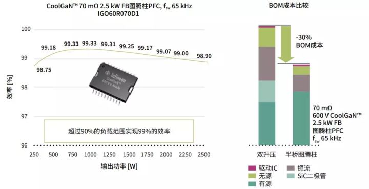 更厲害的是,600V CoolGaNTM產(chǎn)品可支持采用簡單的PFC半橋圖騰拓?fù)?包括棄用有損輸入橋式整流器)。在方案設(shè)計(jì)者可以在兩種不同的結(jié)果中進(jìn)行選擇:一種是效率略微提升但BOM成本顯著下降,另一種則是效率大幅度提升(>99%)但BOM成本有所增加,如下圖所示。