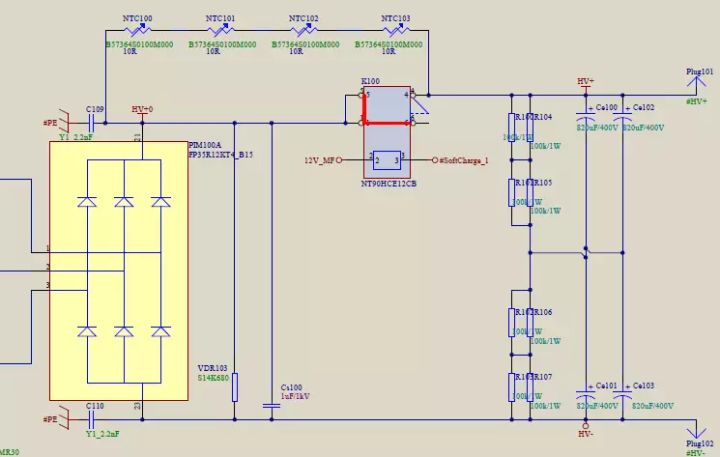 由于直流母線上有大電容的存在,在整流橋輸入上電瞬間,電容兩端相當(dāng)于短路狀態(tài),且其兩端電流突變,這樣就需要有預(yù)充電電路,防止電源接通瞬間的浪涌電流對整流部分的沖擊。本設(shè)計采用的直流母線預(yù)充電電路如圖1所示,熱敏電阻在上電瞬間對電容充電電流進(jìn)行限制,當(dāng)電容組的端電壓達(dá)到母線電壓90%后,將預(yù)充電支路旁路掉。