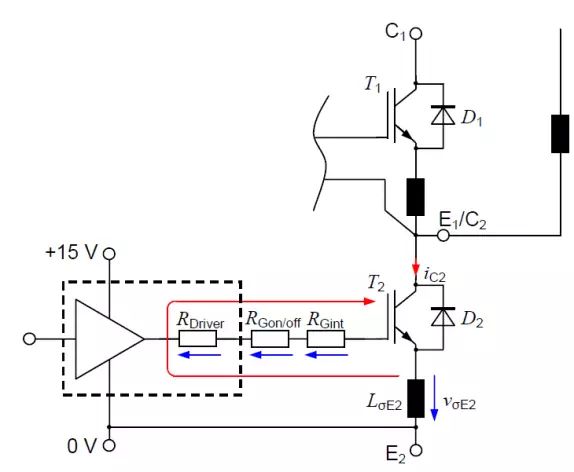 以一個橋臂為例,進(jìn)行分析。如圖5所示,在上管T1開通過程中,D2上的續(xù)流電流向T1換向,二極管的反向恢復(fù)電流變化產(chǎn)生-diC2/dt,位移電流通過下管T2驅(qū)動環(huán)路的雜散電感LσE2,會產(chǎn)生電壓vσE2=-LσE2*(diC2/dt),將E端參考電位拉到負(fù)。當(dāng)感應(yīng)電壓超過IGBT的門極閾值電壓VGEth,會有誤導(dǎo)通的風(fēng)險。