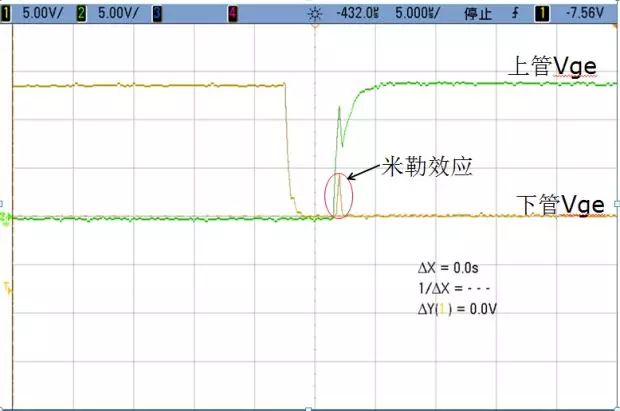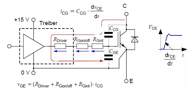 電流iCG流經(jīng)米勒電容、門極串聯(lián)電阻、CGE與直流母線。這個電流在門極電阻兩端產(chǎn)生電壓差,