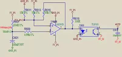 本設(shè)計中使用外接電阻與NTC分壓的方式,如圖11,初步設(shè)定90°C為NTC的溫度保護(hù)點。當(dāng)NTC檢測溫度高于設(shè)定值,比較器輸出高電平信號,OTP點電平翻轉(zhuǎn)。