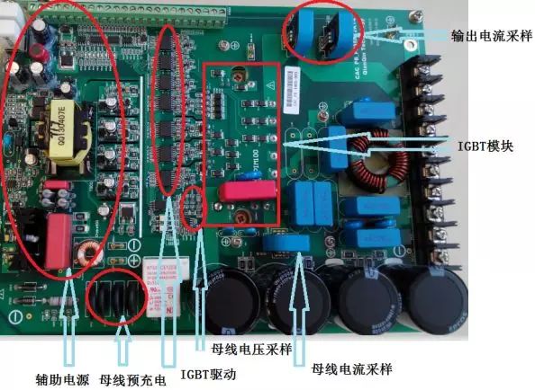 基于上述分析,采用英飛凌公司的IGBT模塊IGBT模塊FP35R12KT4與隔離型驅(qū)動芯片1ED020I12-F2搭建了硬件系統(tǒng),為了實現(xiàn)方便的軟件聯(lián)調(diào),輔助供電部分也包含在同一塊硬件板上,如圖12所示。