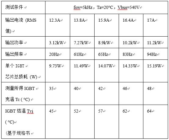 由于測試是在20°C環(huán)境溫度進(jìn)行的,測試所得的最高殼溫,以及推算所得的最高結(jié)溫,還需要綜合考慮空調(diào)客戶系統(tǒng)設(shè)計中實際環(huán)境溫度高達(dá)55°C的要求。由測試結(jié)果可以看出,在55°C環(huán)境溫度下,推算出的本設(shè)計中的IGBT最高結(jié)溫約為100°C,由此可見,本設(shè)計在提升系統(tǒng)功率密度方面依然有較大的改善空間,可以支持使用更高的開關(guān)頻率,增加輸出總功率或者有效減小散熱器尺寸。