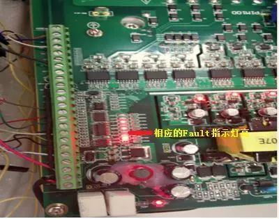 測試實驗除了驗證系統(tǒng)散熱特性,還進(jìn)行了母線電壓保護(hù),以及輸出相間短路保護(hù)的系統(tǒng)驗證測試。由圖15(a)可見,當(dāng)相間短路發(fā)生時,輸出電流關(guān)斷;圖15(b),相應(yīng)環(huán)路中的IGBT發(fā)生退飽和,對應(yīng)的驅(qū)動芯片關(guān)斷此路的驅(qū)動輸出信號,在默認(rèn)延時時間后,輸出故障報錯信號;同時,如圖15(c)所示,設(shè)計板上相應(yīng)的故障指示燈被點亮。